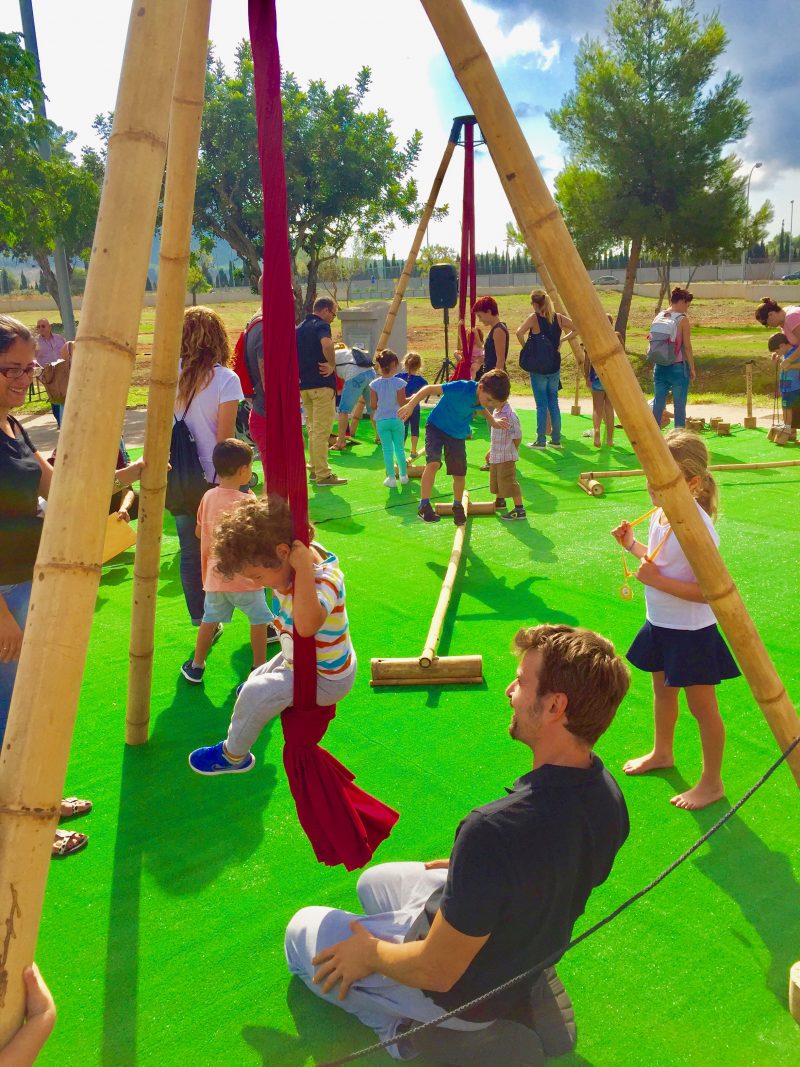 Un circuit de tallers de circ amb diferents elements fabricats amb bambú: xanques, funambulisme, estructures d’aèris amb teles, rulo, pal xinès i malabars.